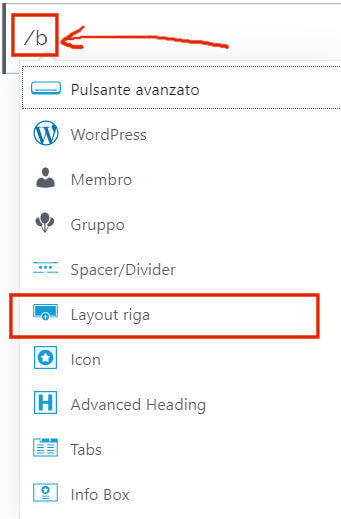 In alternativa puoi utilizzare il simbolo / e cominciare a digitare una lettera, con la sequenza /b vengono elencati alcuni blocchi tra i quali trovi il blocco Layout di riga: