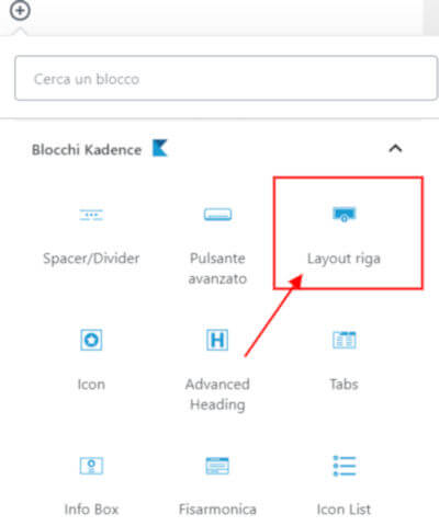 Il blocco layout di riga è messo a disposizione nell’editor di WordPress dal tema grafico installato. Il tema grafico mette a disposizione diversi tipi di blocco per i contenuti e li trovi elencati nell’editor nel gruppo Blocchi Kadence.