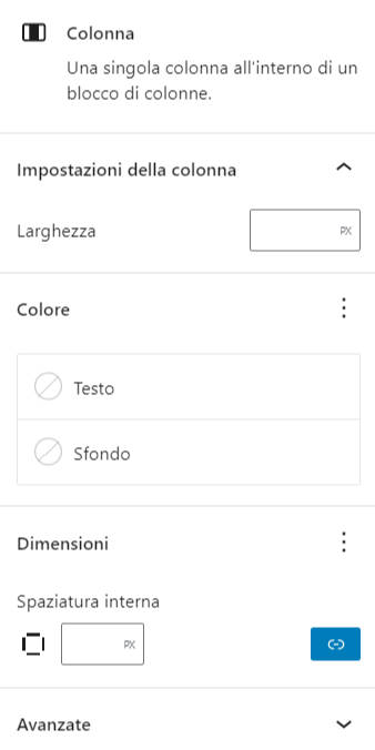 Come puoi vedere il blocco colonne predefinito, non offre molte possibilità di personalizzazione, se non quelle di base. Per questo se per la home page del tuo sito o blog o anche nel singolo articolo, vuoi utilizzare un layout più sofisticato, consiglio l’uso del blocco Layout di riga.