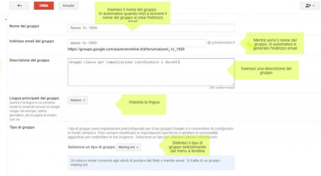 L’indirizzo email del gruppo (Mailing List), si autogenera inserendo un trattino medio tra le parole che compongono il nome del gruppo,