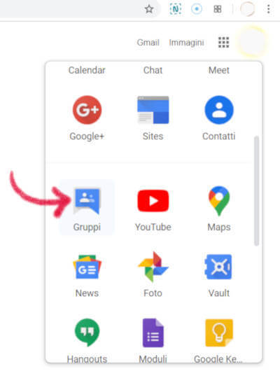 Dal menu 9 pallini fai click sull’icona Gruppi o digita sulla barra degli indirizzi groups.google.com