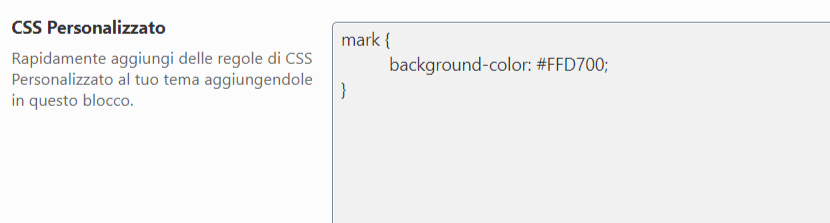 Queste proprietà possono essere scritte minuscole o maiuscole. Adesso tutte le volte che utilizzerai l’elemento “mark”, lo sfondo sarà di colore oro. Se vuoi cambiare lo sfondo potrai riaprire il customizer del tema, andare alla funzione CSS personalizzato, cercare l’elemento mark e sostituire il colore da gold a qualcos’altro.