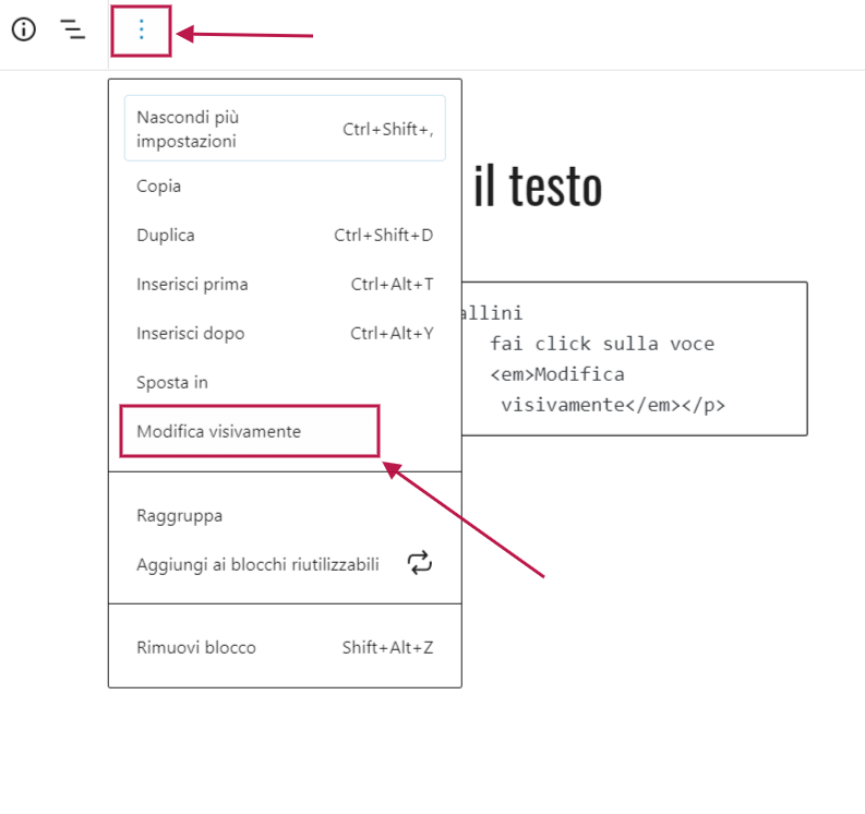 Ora puoi tornare all’editor nel modo visuale, facendo click sul menu tre pallini e sulla voce Modifica visivamente.