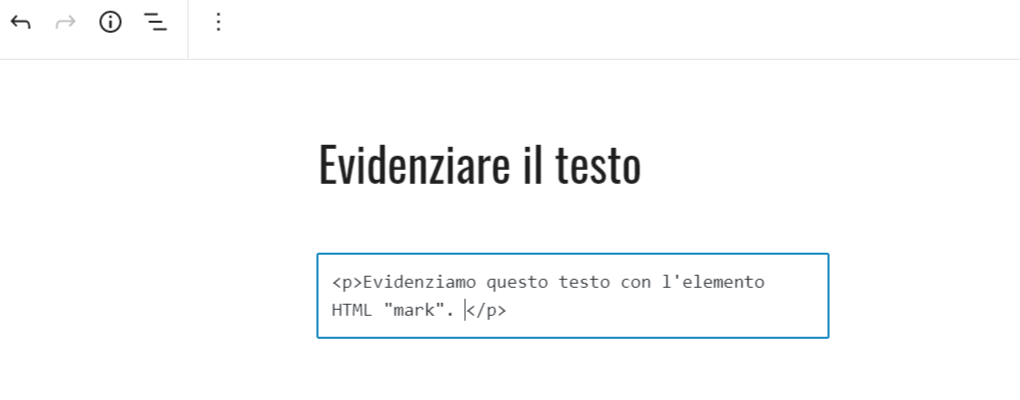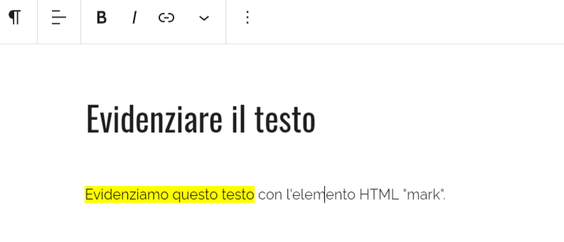 Per evidenziare una parte di testo è necessario utilizzare l’elemento HTML “mark”.