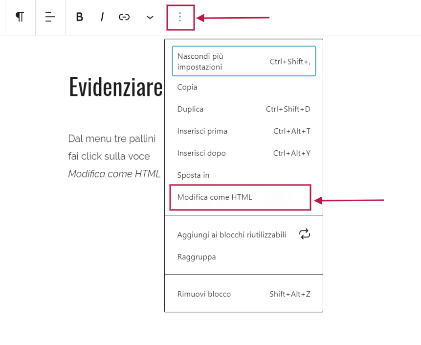 Dopo aver editato il testo del tuo scritto, vai al paragrafo in cui vuoi evidenziare il testo, assicurati che il cursore sia all’interno del paragrafo quindi dal menu tre pallini seleziona la voce Modifica come HTML.