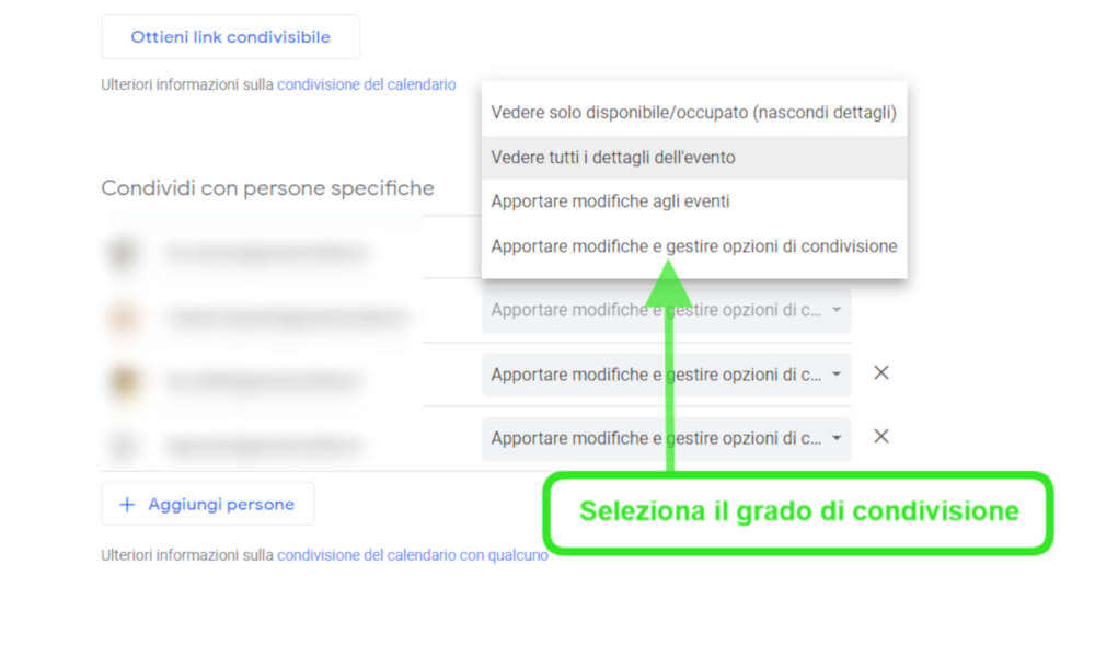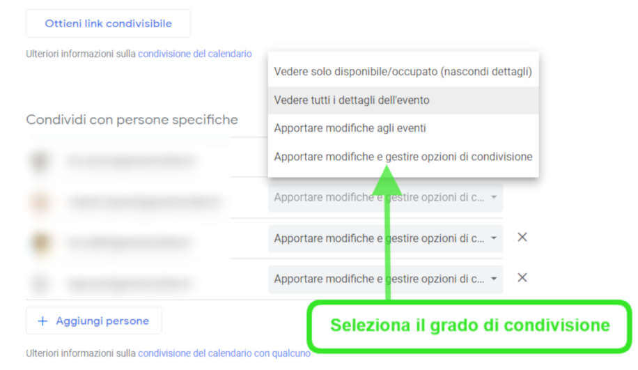 - seleziona quale grado di intervento vuoi consentire al delegato. Possono essere anche gradi diversi a seconda del ruolo che chi condivide il calendario ha all’interno del gruppo di condivisione.