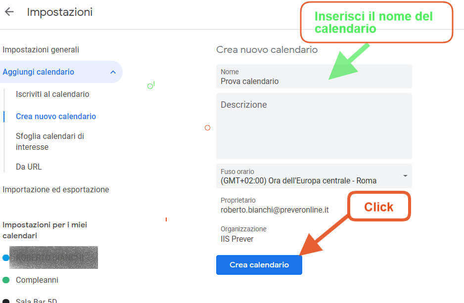 Inserisci un nome significativo per il calendario e una descrizione, molto importante per un calendario condiviso perché consente di capire qual è lo scopo di quel calendario e quali informazioni presenta. Fai click sul pulsante Crea calendario.