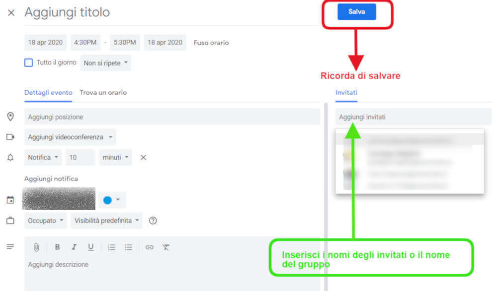 e-mail, separati dalla virgola, nel campo “Aggiungi invitati” e poi salvando. Gli indirizzi e-mail degli