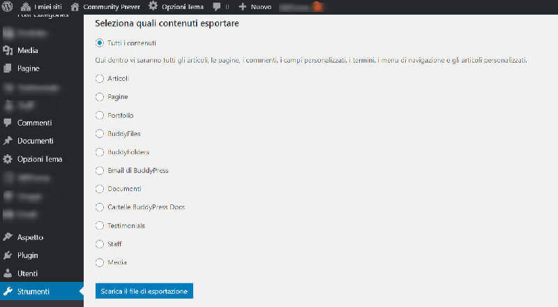 WordPress ha una funzione nativa per esportare gli articoli di un blog. È sufficiente andare in Strumenti > Esporta all’interno dell’area amministrativa, Da qui puoi scegliere di scaricare l’intero sito o solamente gli articoli del tuo blog.