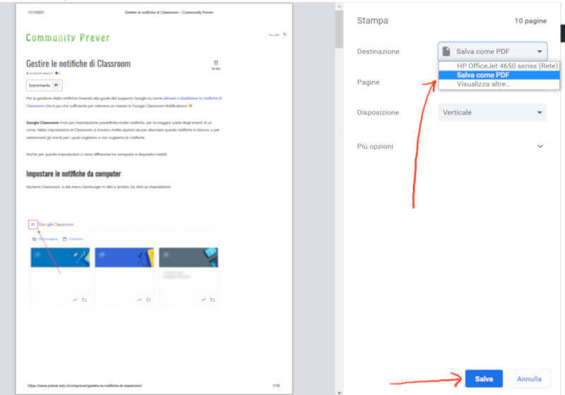 Da qui puoi cambiare la destinazione di stampa su Salva come PDF e cliccare sul pulsante Salva per scaricare l’articolo sul tuo computer.