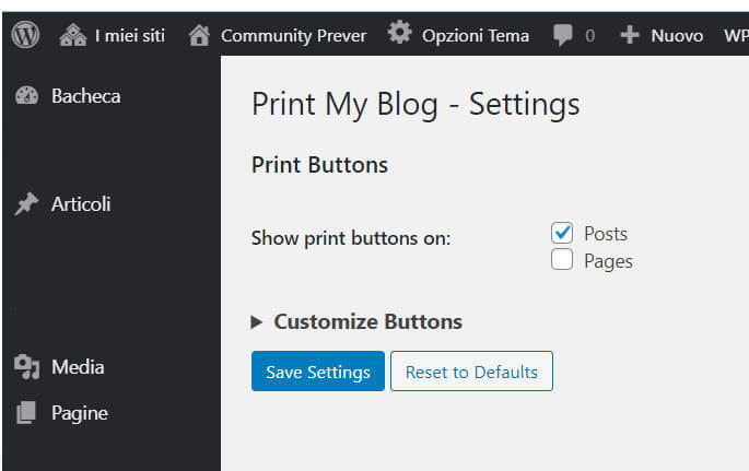 Cliccando su questa voce si apre la pagina su cui potrai scegliere le opzioni che più si adattano alle tue necessità. Facendo click su Setting potrai scegliere se inserire le tre icone per la stampa sugli articoli, sulle pagine o, se selezioni entrambe le opzioni, sia sugli articoli che sulle pagine.