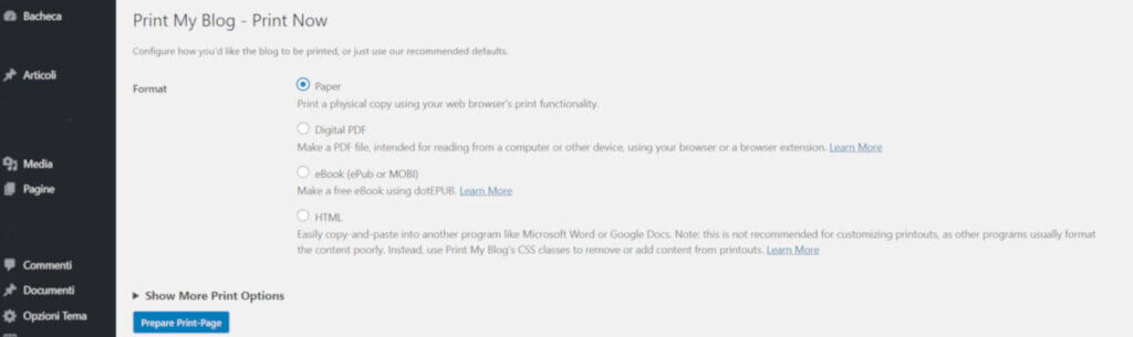 Alla voce Print Now del menu Print my blog, si apre una pagina con quattro opzioni che consentono di selezionare il formato del file di esportazione