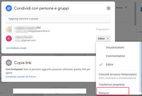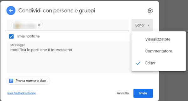 Puoi scegliere di condividere il file nel modo che preferisci e puoi definire quali azioni può compiere sul file la persona o le persone con le quali condividi il documento:
