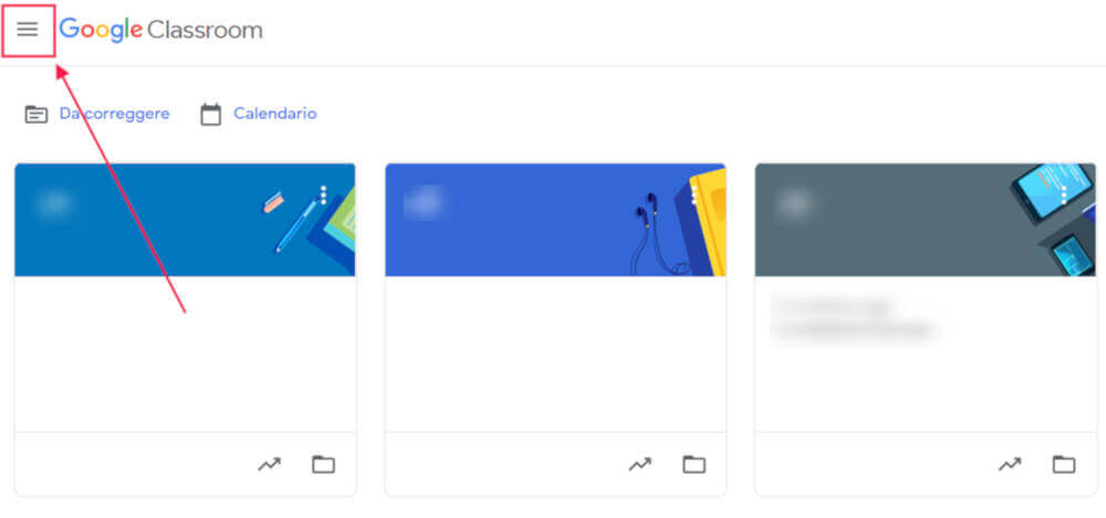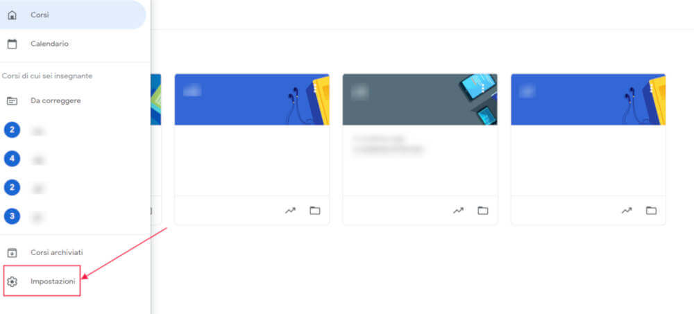 Apriamo Classroom, e dal menu hamburger in alto a sinistra, fai click su Impostazioni.