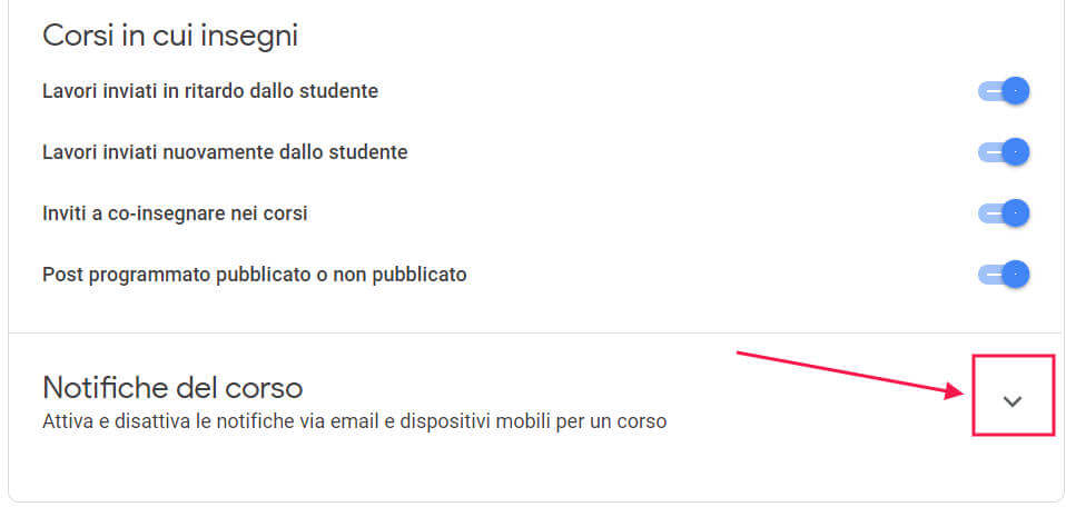 L’ultima sezione della pagina è Notifiche del corso. Se le voci di questa sezione non sono visibili, devi espanderla cliccando il triangolino a destra. Appare la lista di tutti i corsi di Classroom di cui siamo insegnanti, o a cui siamo iscritti.