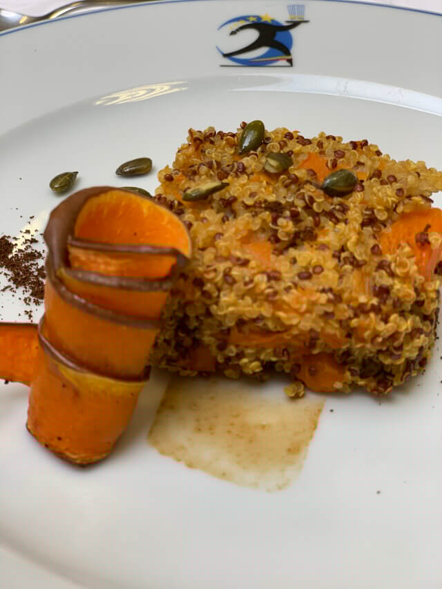 Tortino di quinoa con zucca, polvere di caffè e semi tostati.