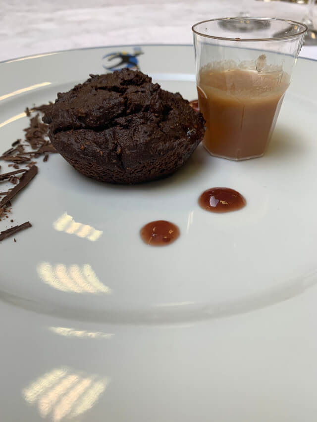 Sacher-Smart con marmellata di lamponi e cioccolato fondente accompagnata da centrifugato di pera e zenzero.