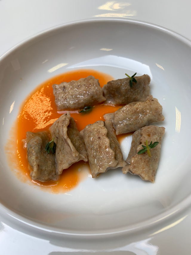 Plin ai fagioli neri serviti con estratto di carote e timo