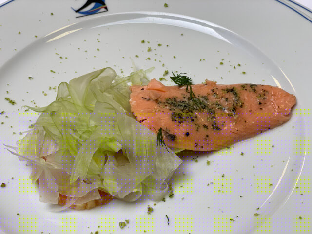 Trota salmonata cotta a bassa temperatura con salsa agli agrumi e millefoglie di finocchi, sedano e arance rosse.