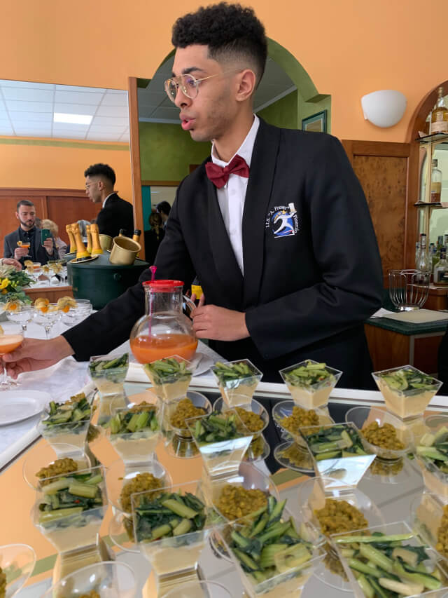 In questo terzo evento del progetto tenutosi presso l’Istituto A. Prever di Pinerolo, insegnanti e dirigenti scolastici dei diversi alberghieri coinvolti, accolti dalla classe IV H (accoglienza), hanno avuto la possibilità di degustare le preparazioni realizzate dalla classe V E (enogastronomia) e servite dalla classe V G (sala e vendita). L’elaborazione grafica del menu è stata, infine, realizzata dalla classe V I (accoglienza).