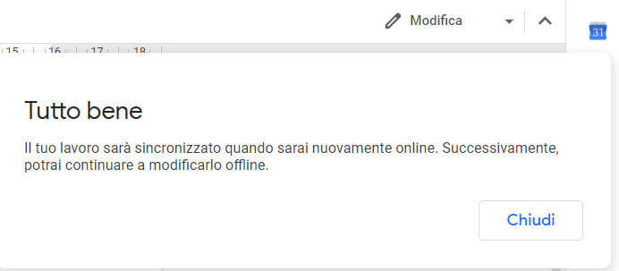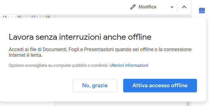 Ma cosa succede se stai lavorando sul tuo documento, e la connessione dovesse interrompersi? Ecco che in questo caso la modalità offline mostra tutta la sua importanza perché consente di continuare a lavorare sul file senza interruzioni e senza il timore che i contenuti siano persi,