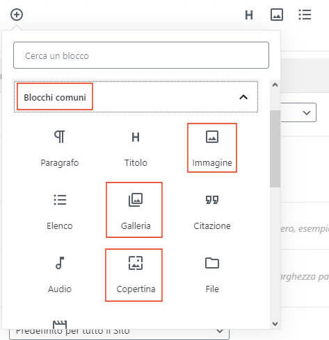 Ogni blocco per le immagini, ha associata un’icona. In questo modo è più semplice riconoscerlo tra i tanti presenti nell’editor. Per trovare rapidamente il blocco che cerchi, puoi digitare il tasto chiave / (slash) all’interno della riga Cerca un blocco, seguito dal nome del blocco. Non è necessario conoscere esattamente il nome del blocco o scriverlo per intero, perché, quando inizi a scrivere le lettere che compongono il nome del blocco che stai cercando,, l’editor presenta tutti i blocchi il cui nome inizia con quelle lettere.