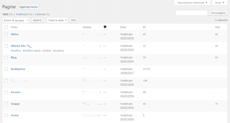 Si può cliccare sul nome dell’autore per filtrare le pagine create da quell’autore, oppure si possono filtrare le pagine attraverso i link in testa alla pagina, Pubblicati e Cestinati.