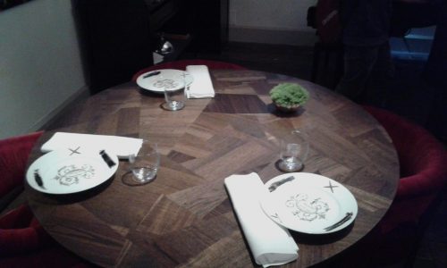 I tavoli, progettati da Martino Gamper, sono appositamente lasciati senza tovaglia per non coprire la sua opera.