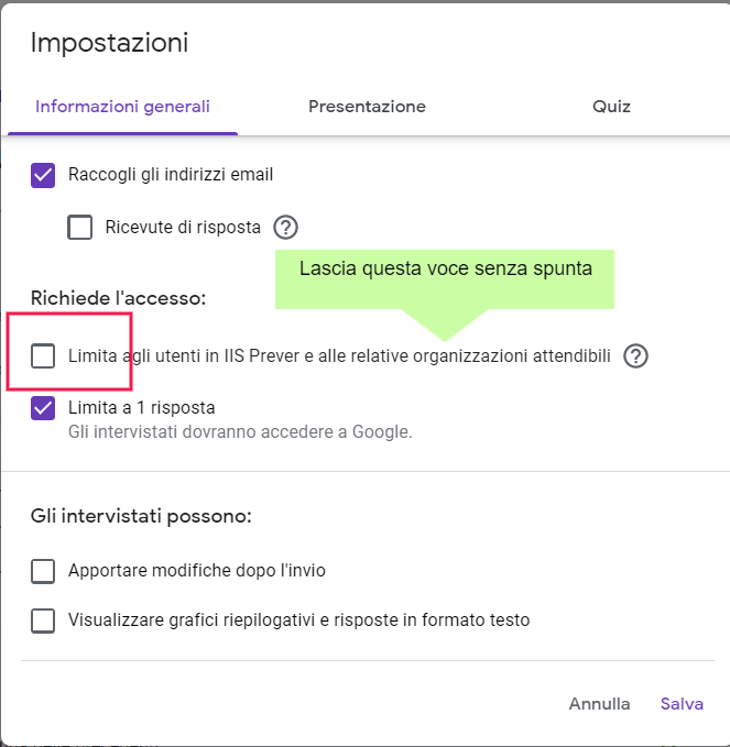 Il questo caso è però consigliabile aggiungere al modulo la voce nome e cognome dello studente, in quanto non sempre è semplice risalire a queste informazioni dagli account di posta elettronica privati.